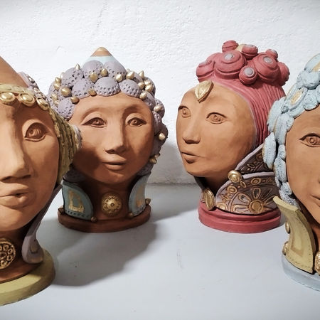 Sono volti arcaici e poetici, capaci di abitare lo spazio con una presenza discreta ma intensa. Ognuno porta con sé un’emozione, un pensiero, una ferita o una gioia antica. A volte ricordano le divinità mediterranee, a volte volti incontrati in sogno, altre volte sembrano appartenere a un popolo senza tempo, fatto di donne e uomini che hanno vissuto, amato, perduto e sperato — come noi.